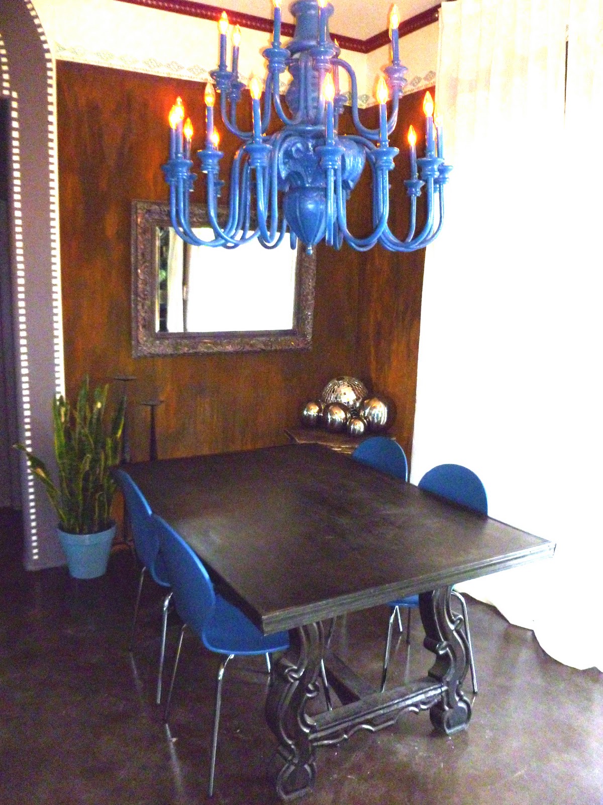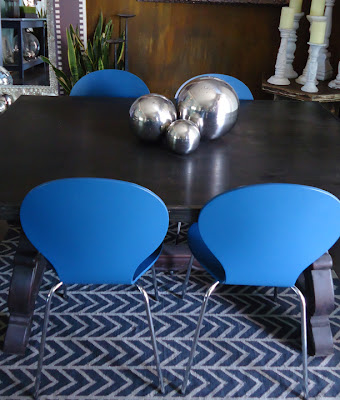 The Dining room gets a huge hit of color with an over-the-top giant chandelier! The chairs, in a coordinating shade of blue add a modern shape and bring more color.![]() |