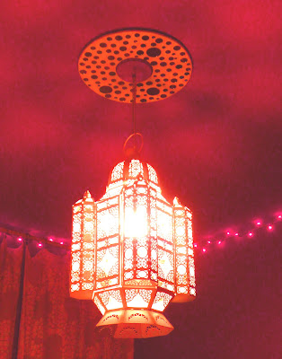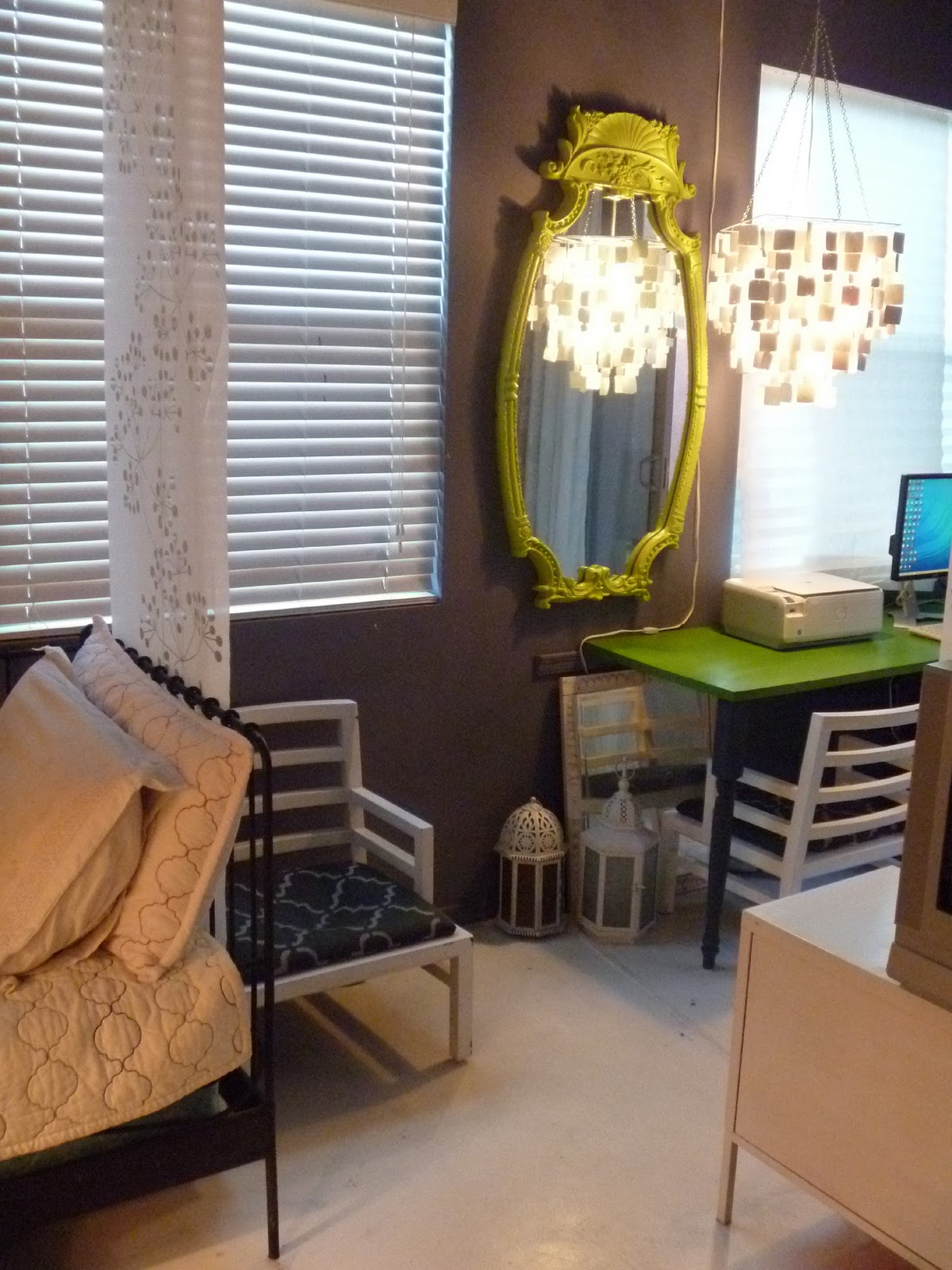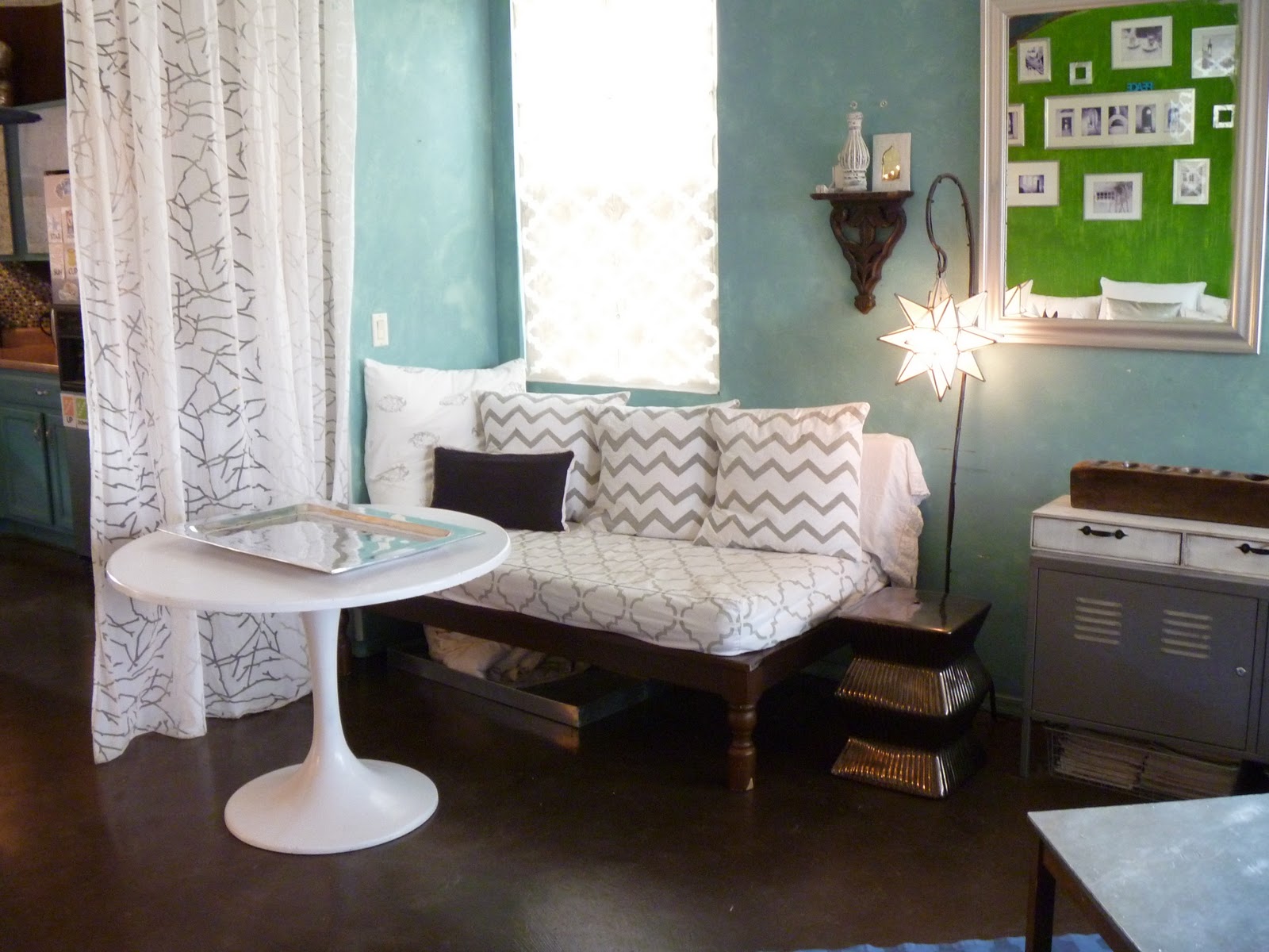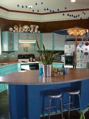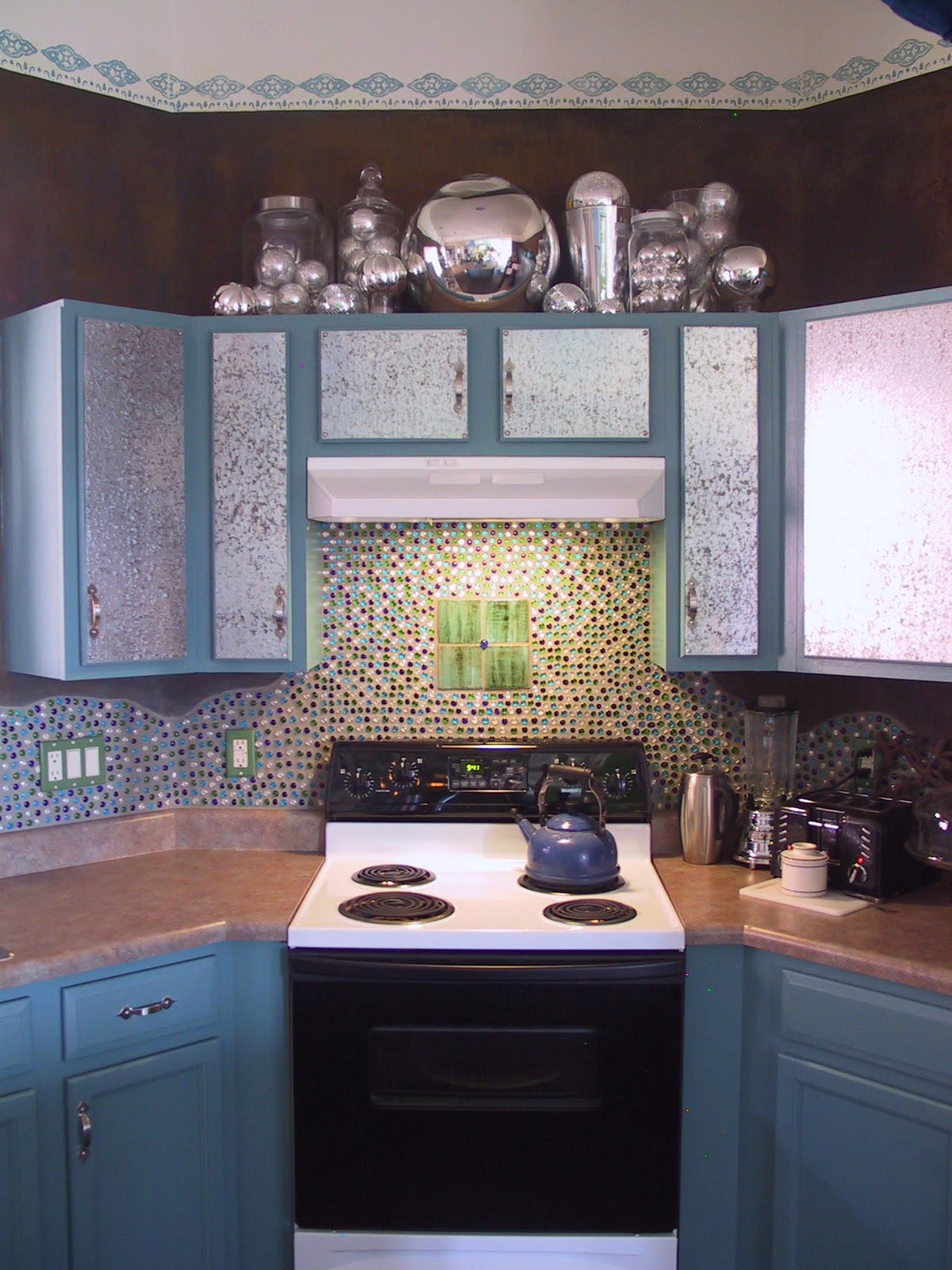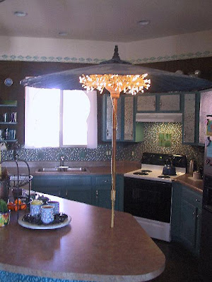 In the kitchen, I made the backsplash by gluing on glass craft beads (the kind with the flat back) one by one, and then grouting. This whole project cost me under $100....glass tile would have cost over $500, and I like this BETTER! I also drilled a hole in my kitchen island to place an indoor umbrella/light fixture. This is one of my very favorite things in my home...it makes me smile everyday. Boring, out of the box oak cabinets got painted and faced with galvanized metal on the uppers, for that touch of industrial chic that I love.![]() |