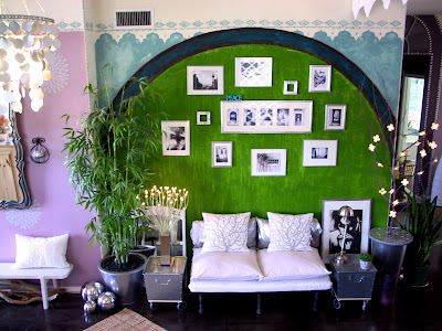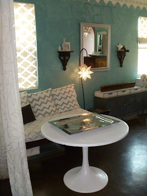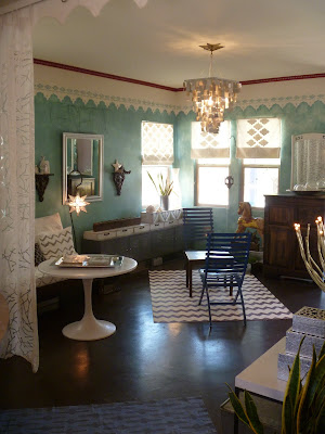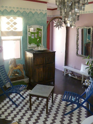 My living room is an explosion of color, pattern and texture. Cool metal accessories, dark polished concrete floors, vintage finds mixed with industrial pieces, hand painted floor cloths, and furniture covered with hand stenciled slip covers make for an eclectic, comfortable and family friendly room.![]() |