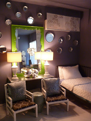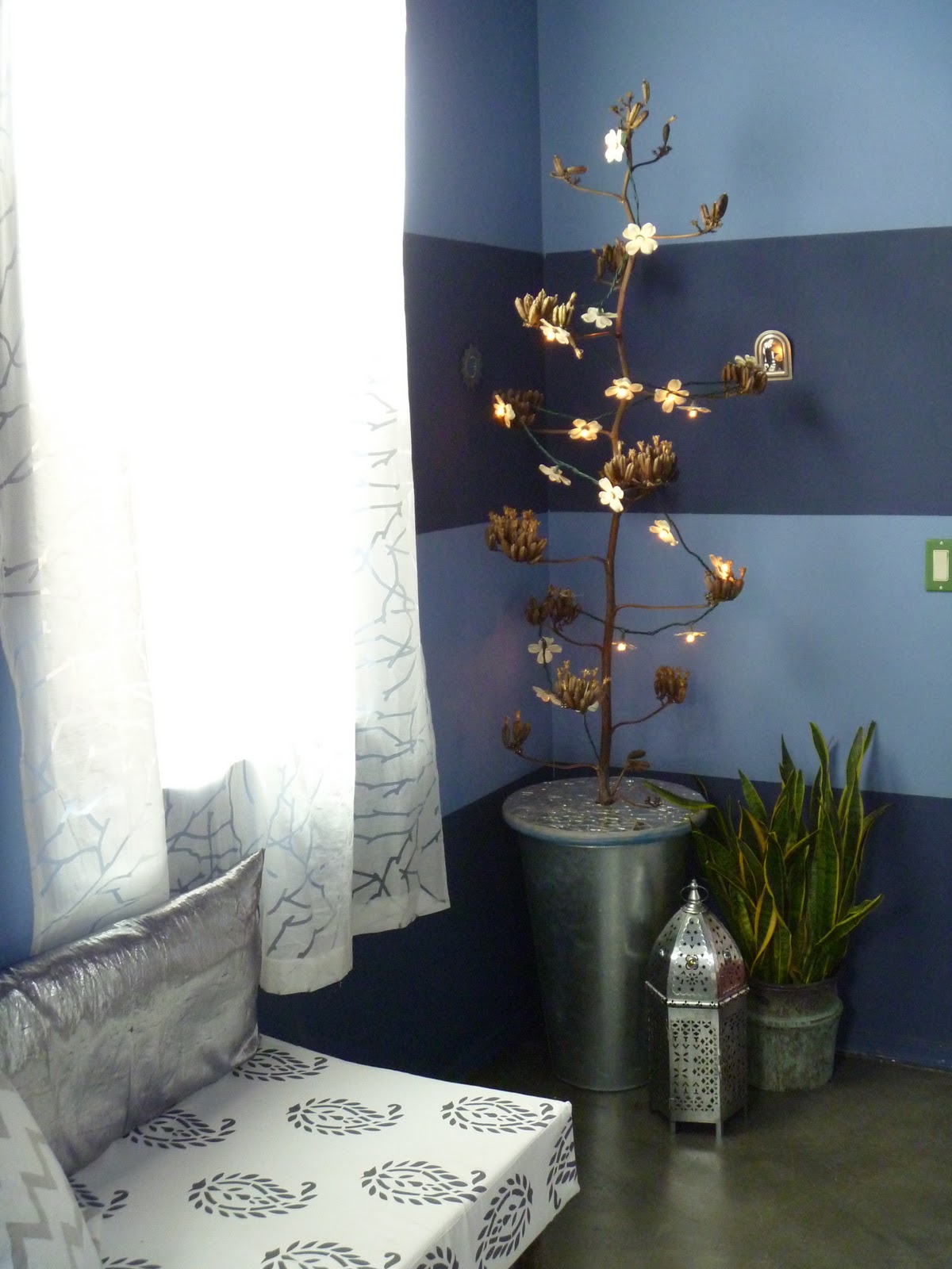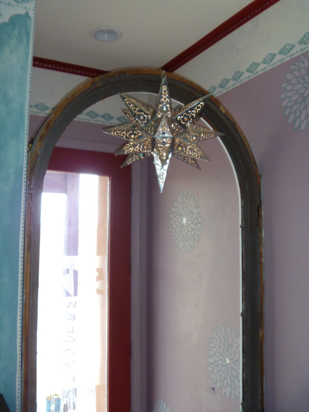 | A small medallion in front of the 'throne' ties in with the stenciled runner. |