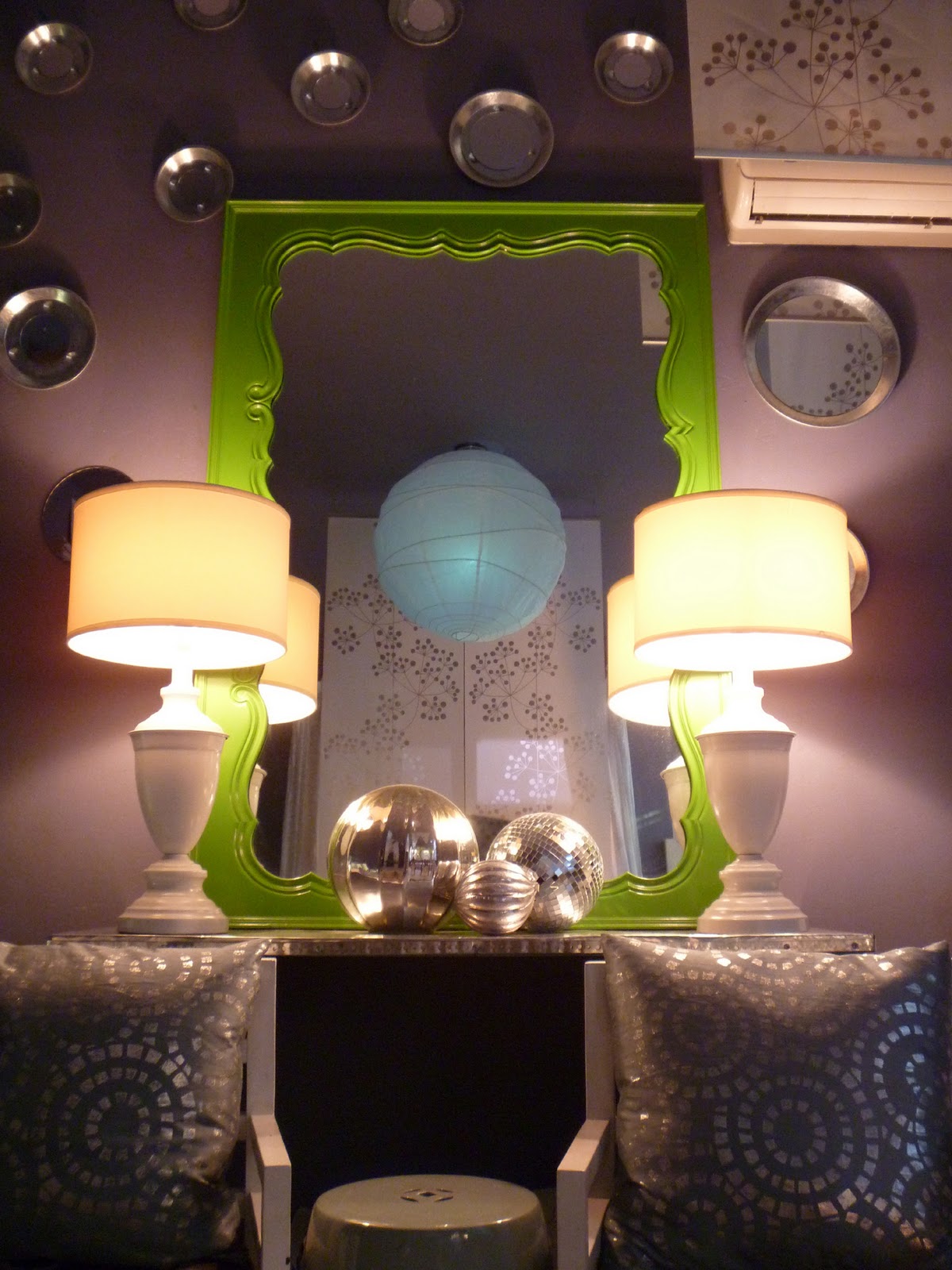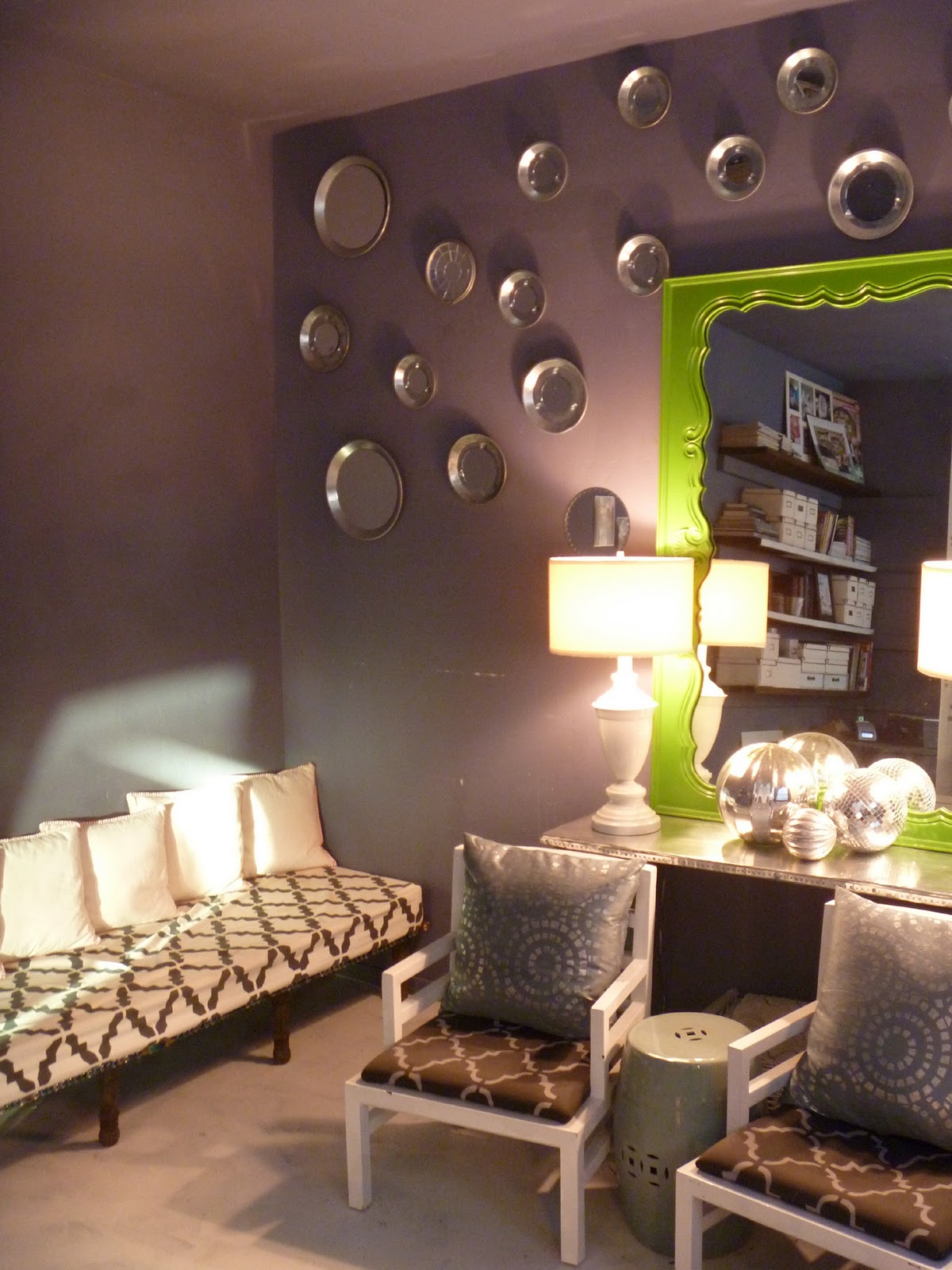 | All those round mirrors on the wall are galvanized metal plant saucers! I just glued plain round mirrors inside and glued some rope to the back for hanging. |
